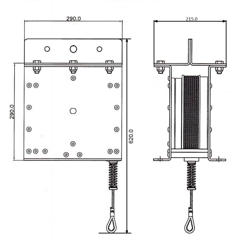 Anticaduta per carichi può essere montato su una struttura o sospeso. Funziona con uscita cavo verso il basso o verso l'alto (fissata alla parte fissa o alla parte mobile). Sulla parte superiore, 2 fori: 1 per il sollevamento, 1 per il fissaggio (ancoraggio).