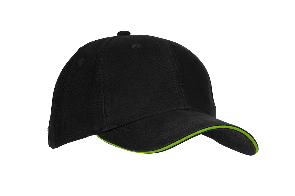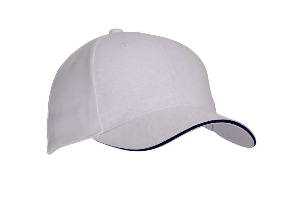 Cappellino unisex 6 pannelli, in twill spazzolato di cotone, con visiera precurvata con sandwich a contrasto, asole ricamate e chiusura regolabile con fibbia e bottone automatico.
