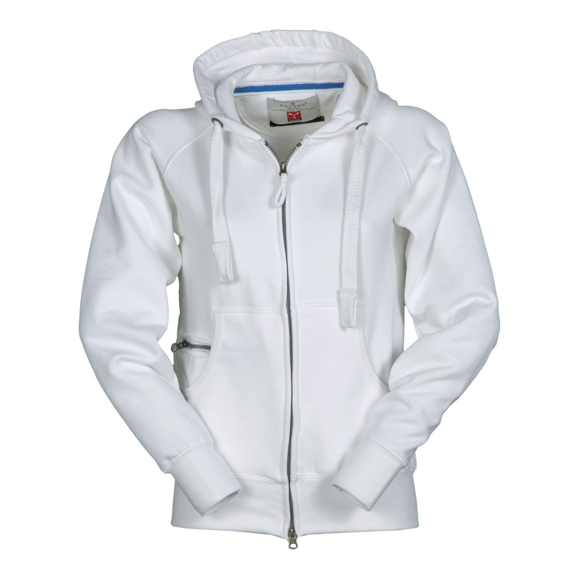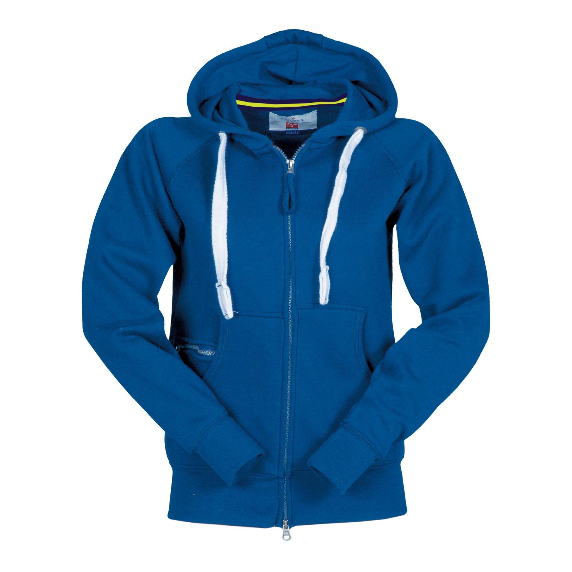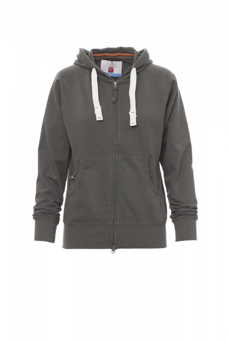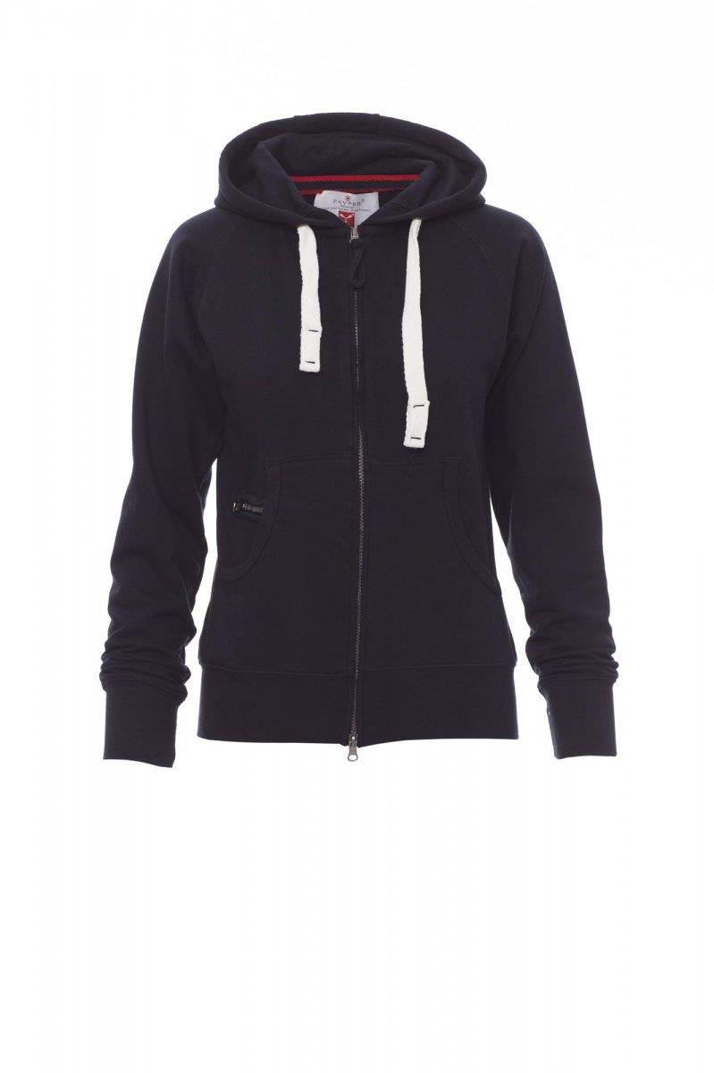 Felpa da donna svasata, zip intera SBS coperta con doppio cursore in metallo, cappuccio con due cuciture, coulisse bianca con impunture abbinate alla felpa e agli anelli in metallo, manica raglan, tasche a marsupio con tasca con zip, polsini e vita in costina elasticizzata. Cuciture rinforzate.