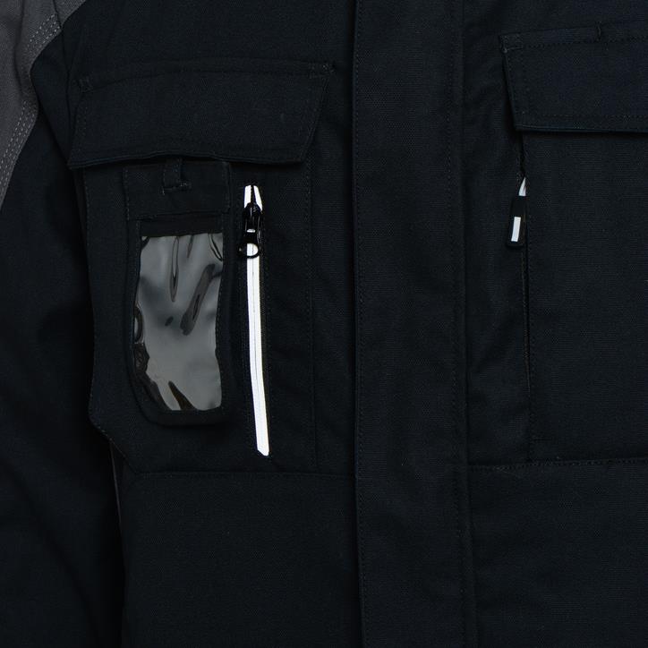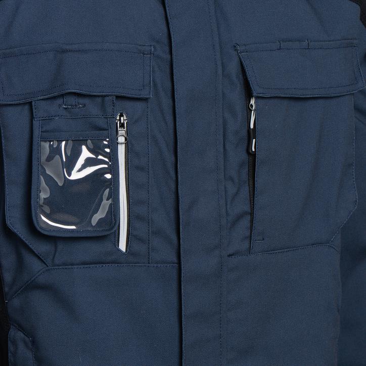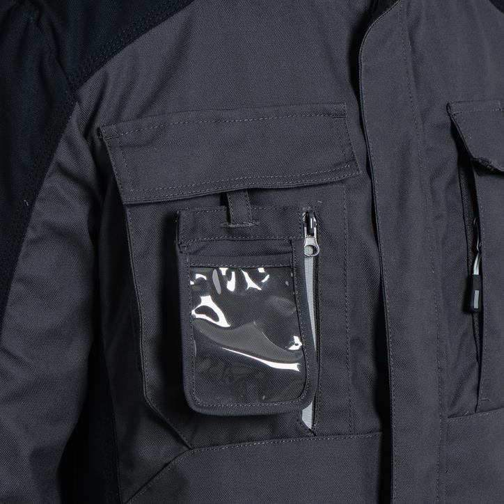 Giacca multitasche in tela con tecnologia di traspirazione Sistema respiratorio licenziata da Geox, regolabile in vita e polsi, porta badge, dettagli rifrangenti, tasche mani zippate, tasca interna, tripla cucitura, taglio manica ergonomico.