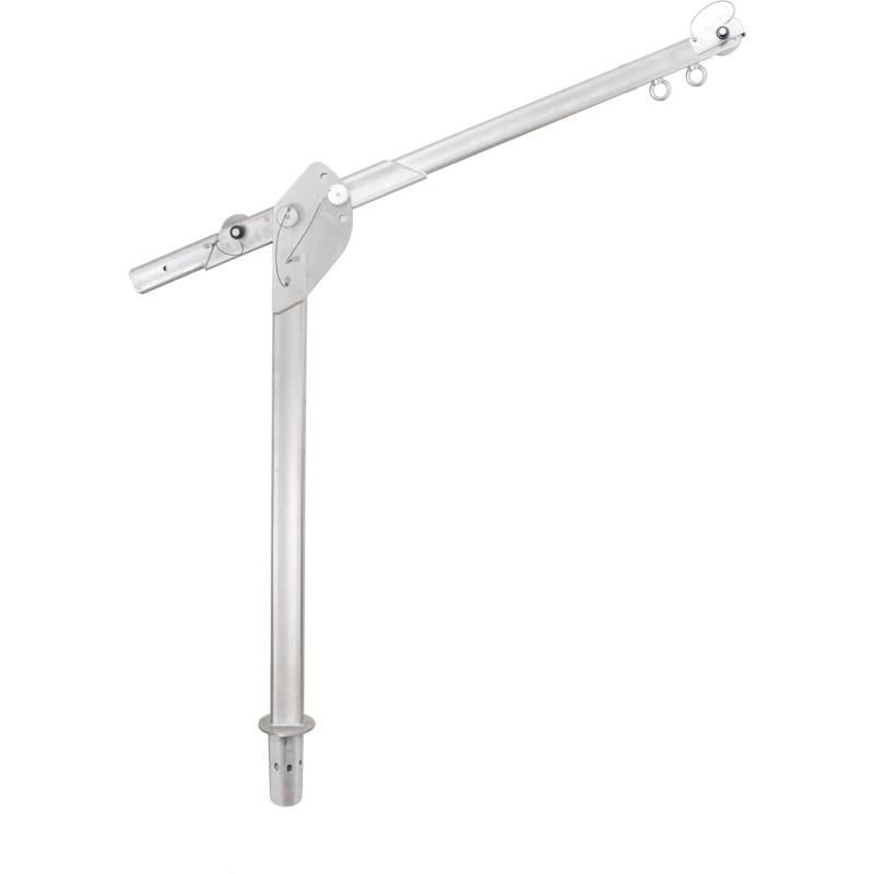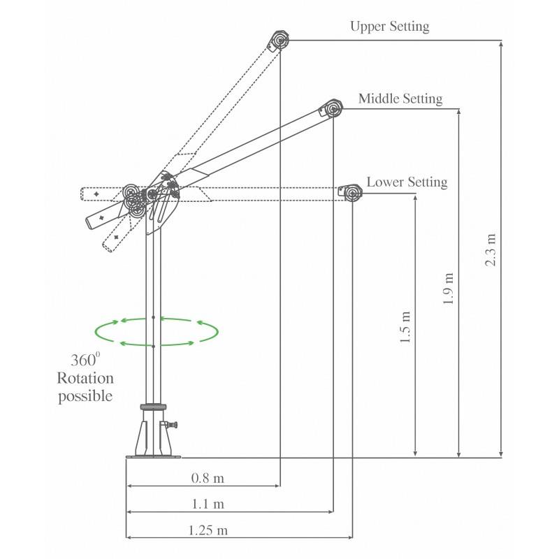 Braccio regolabile a 3 altezze predefinite (2,3m / 1,9m / 1,5m), che può essere piegato lungo il piede e attaccato con una cinghia per facilitare il trasporto della gruetta.