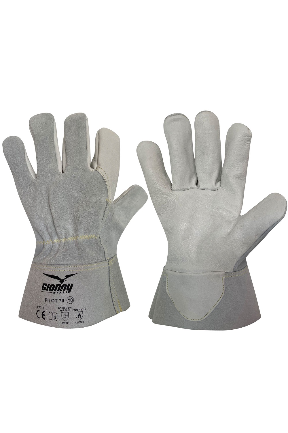 Guanto con palmo e dito indice in fiore bovino, dorso in pelle crosta bovina e manichetta in pelle crosta di bufalo da 7 cm. Protezione salvavena in fiore bovino ed elastico stringi polso. Cuciture in filato para-aramidico.
