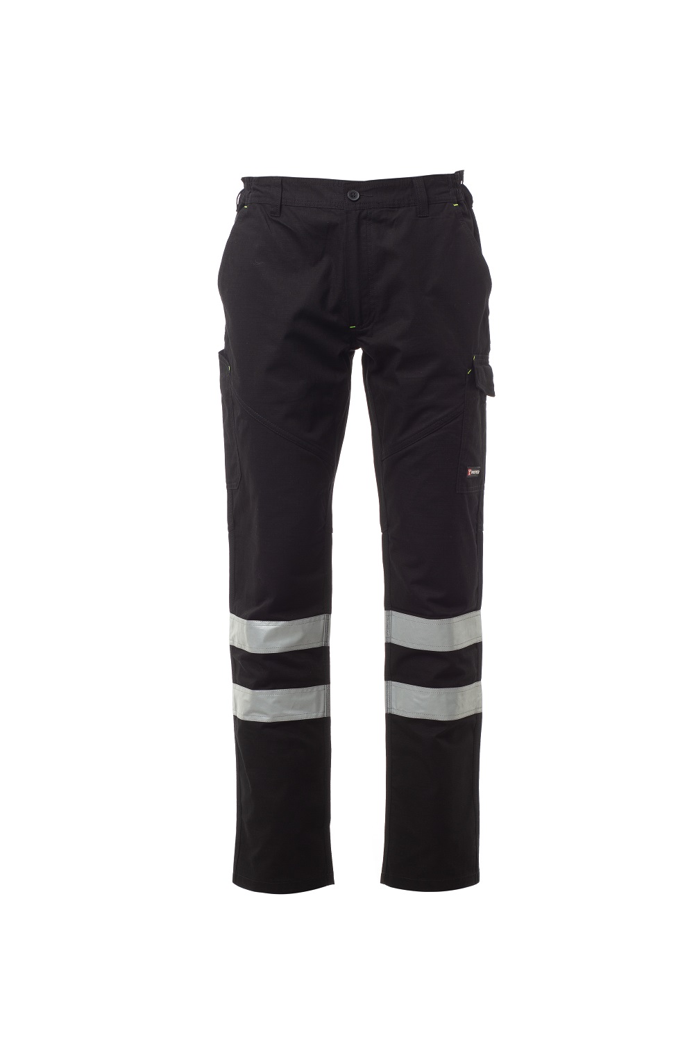 Pantalone da lavoro estivo unisex realizzato in 100% cotone, con bande riflettenti in cat. 1, munito di elastici laterali e passanti in vita, chiusura con zip e bottone in plastica.