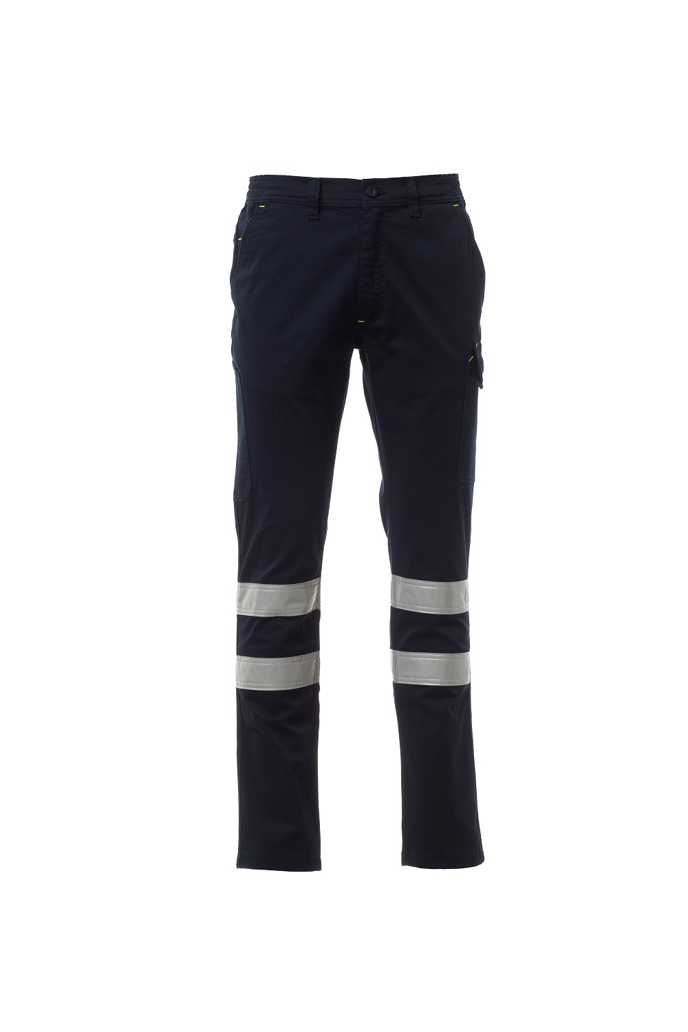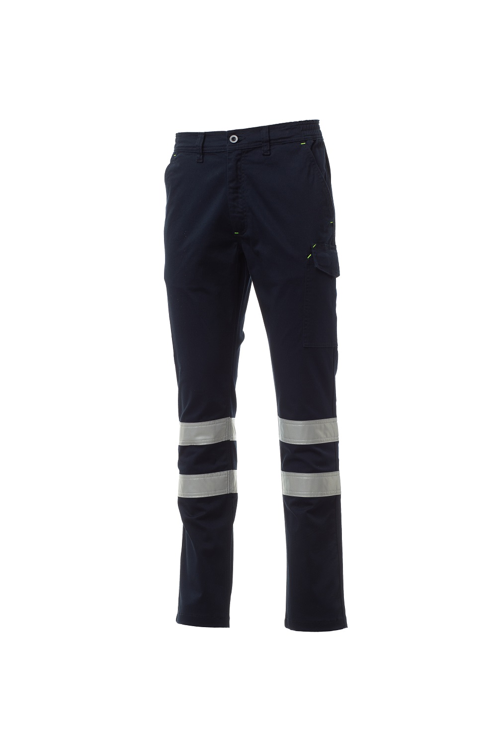 Pantalone in twill stretch di cotone, con bande retroriflettenti di cat. 1, con passanti ed elastico in vita, chiusura con zip e bottone. Due tasche anteriori con taglio alla francese, taschino porta monete, porta metro laterale dx, tasca laterale sx con patta di chiusura LOCK SYSTEM, due tasche posteriori di cui una con patta e velcro. Cuciture a triplo ago.