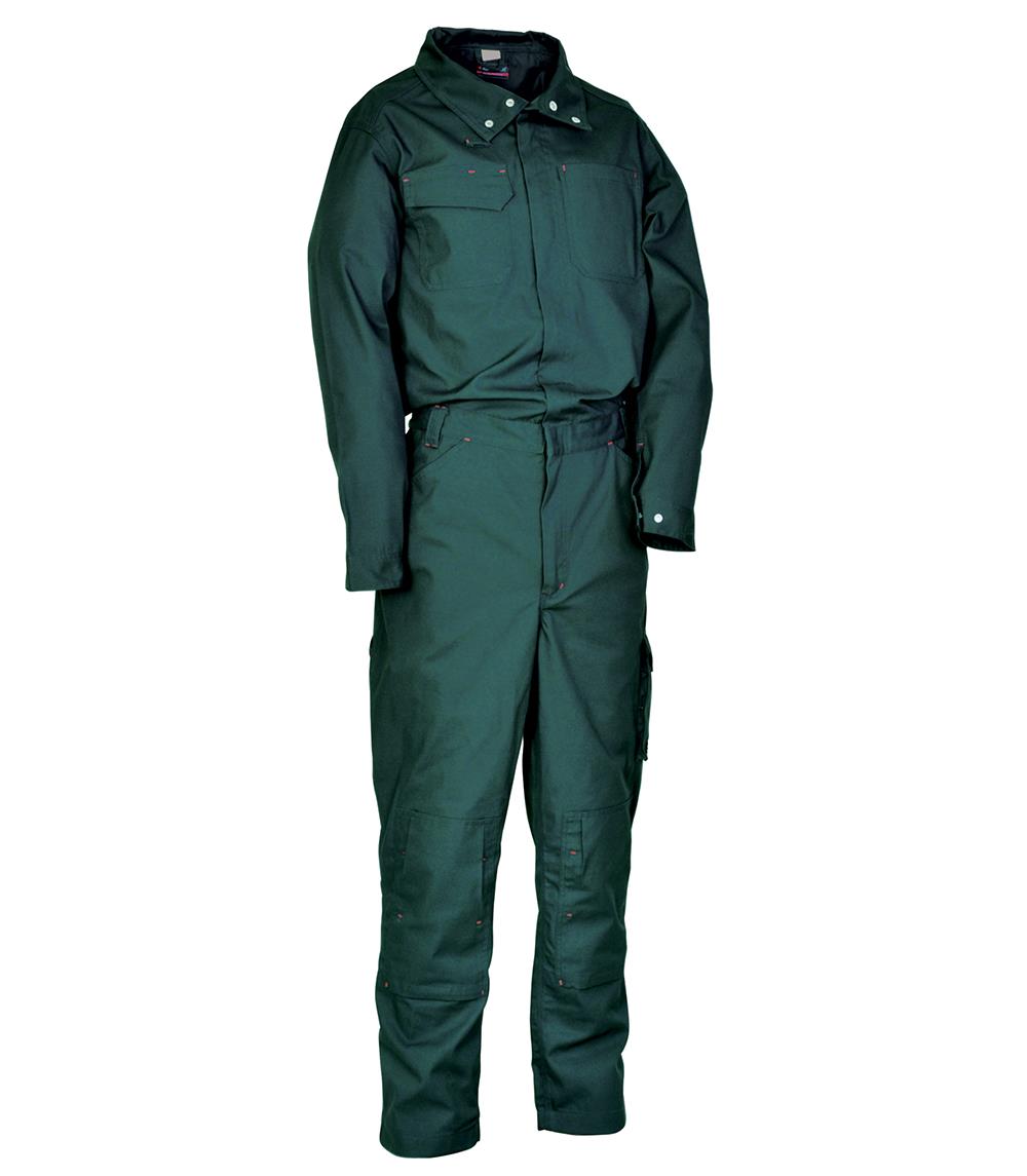 Tuta Cofra da lavoro munita di 2 tasche sul petto con velcro, ampie tasche anteriori, apertura centrale con zip, elastico in vita, inserto portapenne, passante portamartello, polsino regolabile, tasca portametro, tasca posteriore con velcro, tasche per ginocchiera con posizione regolabile