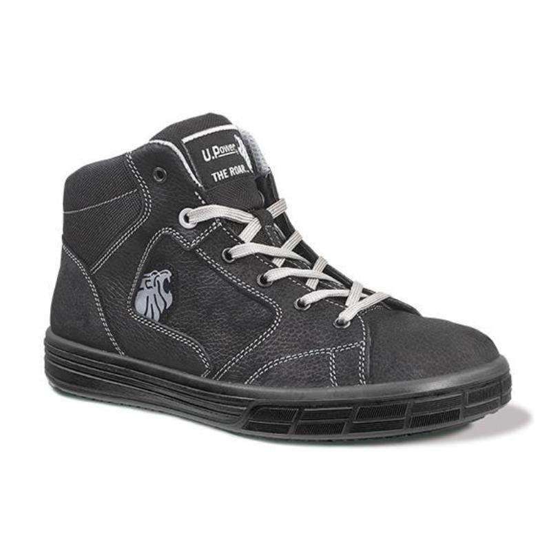 Scarpa antinfortunistica alta, leggere e comode u power della linea The Roar, con tomaia in pelle Nabuk naturale bottalato, idrorepellente, puntale in alluminio, antiperforazione, antiscivolo e suola PU/PU LIGHT GRIP, S3 SRC